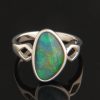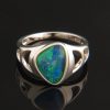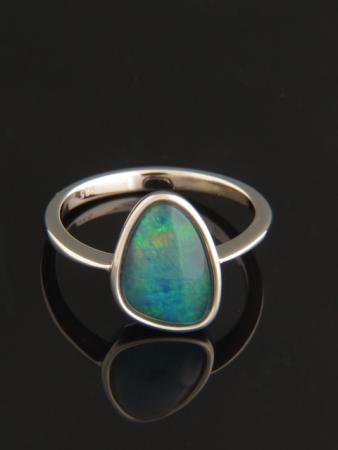 This Sterling Silver ring features a freeform shaped Boulder Opal triplet cabochon with a dark blue base colour and shows vibrant green opalescence with hints of pink and yellow.