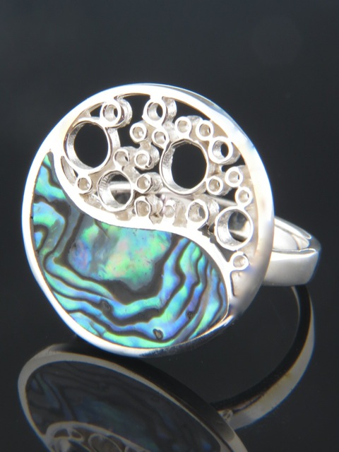This Sterling Silver ring features inlaid New Zealand Paua Shell in a stylised “YinYang” design.