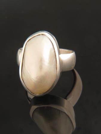 This Sterling Silver ring features a Baroque (irregularly shaped) Pacific Pearl.
