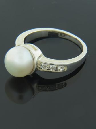 This Sterling Silver ring features a white Pacific Pearl with faceted Zircons set in the shoulders of the band.