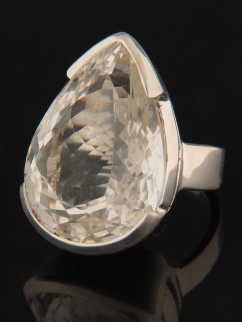 This Sterling Silver ring features a large, faceted, teardrop shaped Clear Quartz crystal stone.
