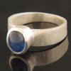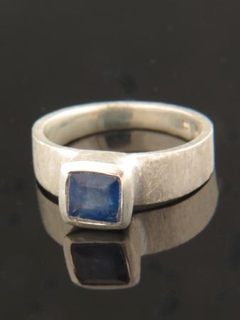This textured Sterling Silver ring features a faceted, square shaped Blue Sapphire stone.