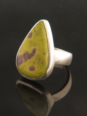 This Sterling Silver ring features a teardrop shaped cabochon of Serpentine with purple Stichtite inclusions from Tasmania, Australia.