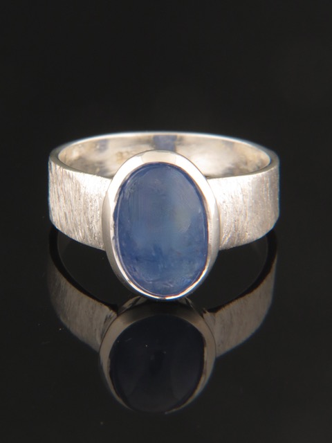 This Sterling Silver ring features an oval shaped Tanzanite cabochon with a brush-finished band.