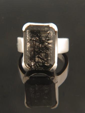 This Sterling Silver ring features a faceted, rectangular shaped Tourmalinated Quartz stone.