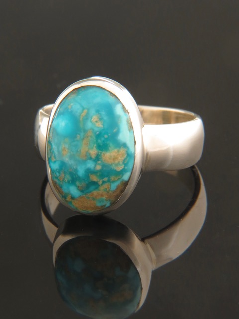 This Sterling Silver ring features an oval shaped Turquoise cabochon.