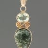 This Gold Vermeilpendant has an irregular trapezoidal Blue Moonstone cabochon with two teardrop Garnet cabochons and spiral features.