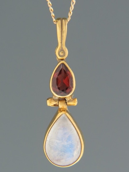 This Gold Vermeilpendant features a teardrop Blue Moonstone cabochon with a faceted teardrop Garnet stone.