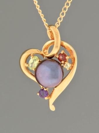 This Gold Vermeilheart design pendant features a dark Pacific Pearl with faceted Peridot, Garnet and Amethyst accent stones.