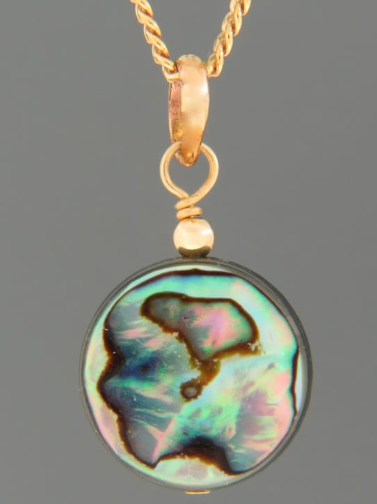 This pendant features a round double sided New Zealand Paua Shell piece with 14ct Gold Filled fittings.