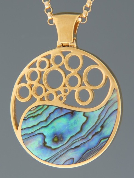 This Gold Vermeilpendant features inlaid New Zealand Paua Shell in a stylised yin-yang design.