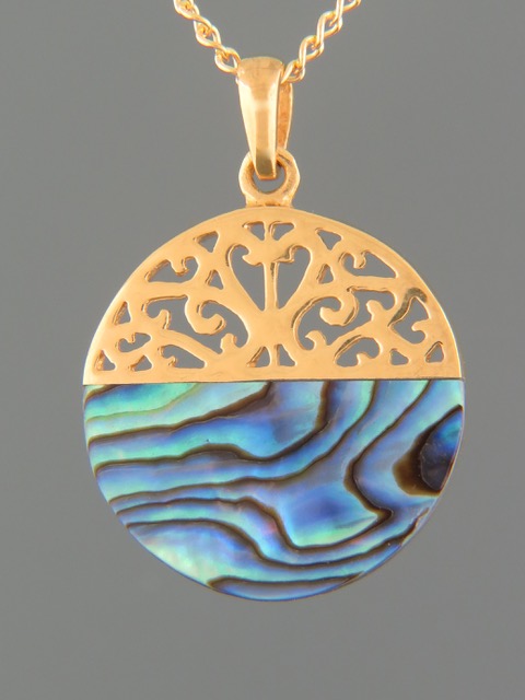 This Gold Vermeilpendant features inlaid New Zealand Paua Shell.