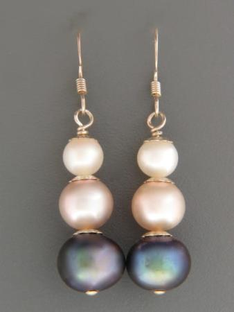 These Sterling Silver drop style earrings feature dark, pink and white Pacific Pearls.