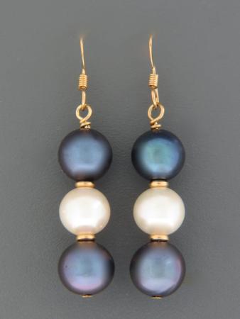 A drop style earring featuring two dark and one white Pacific Pearl with gold fittings.