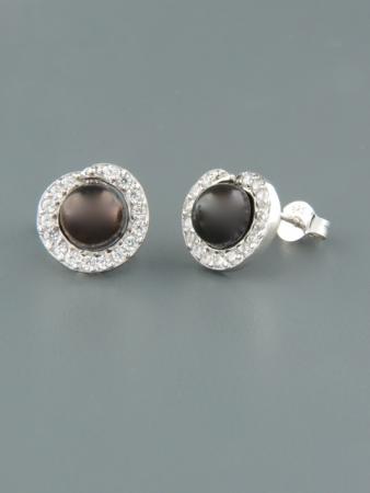 These Sterling Silver stud style earrings feature dark Pacific Pearls with round faceted Zircon accent stones.