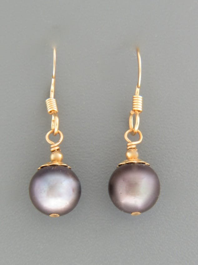 A drop style earring featuring dark Pacific Pearls with gold beads.