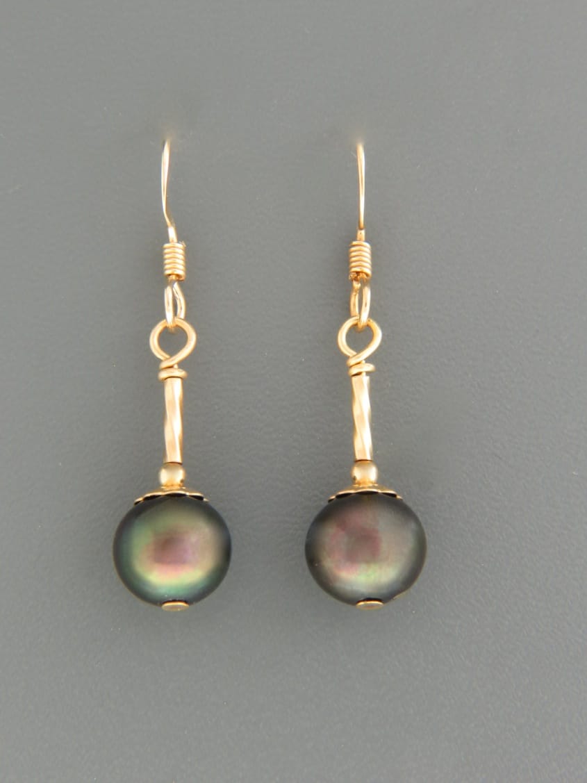 A drop style earring featuring dark Pacific Pearls with gold beads.