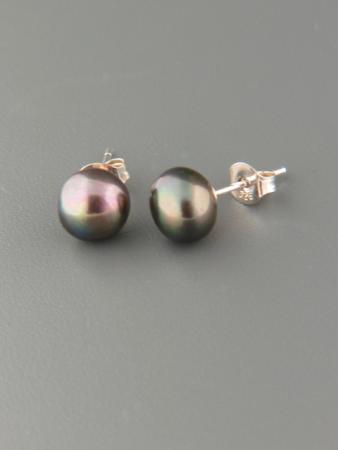 A Sterling Silver stud style earring featuring dark Pacific Pearls .