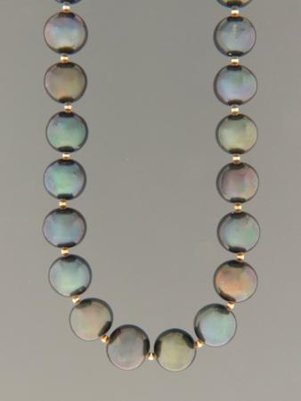 This necklace features dark green and bronze coloured Pacific Pearls with 2mm round Gold beads.