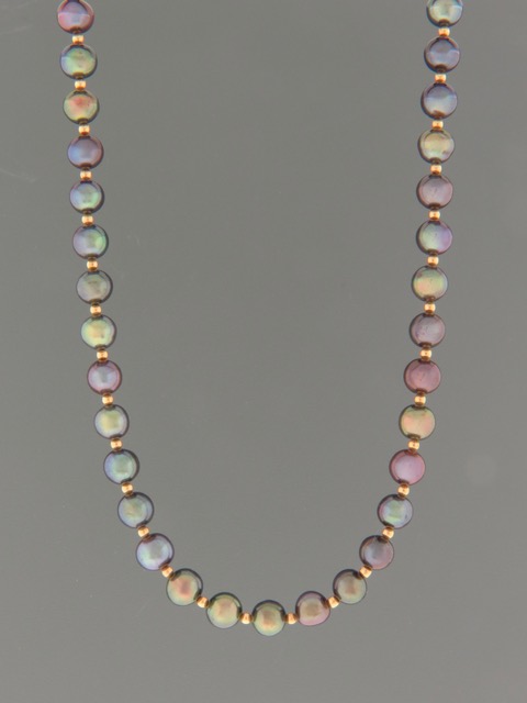 A necklace featuring dark Pacific Pearls with 2mm round gold beads.
