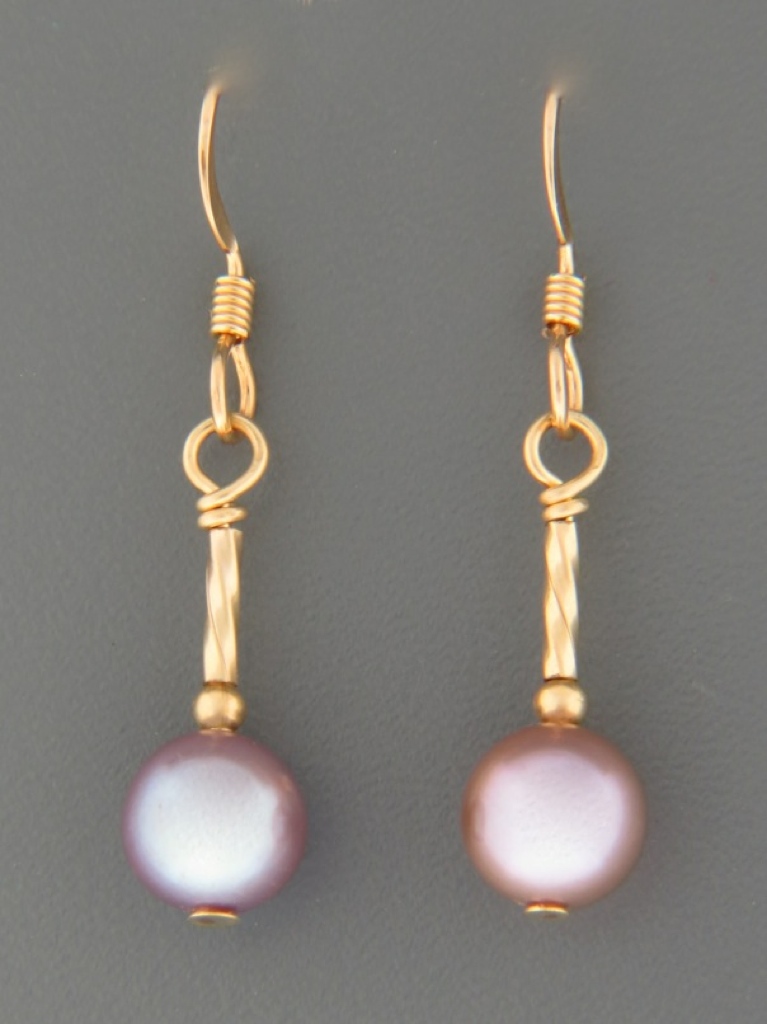 A drop style earring featuring pink Pacific Pearls with Gold beads.