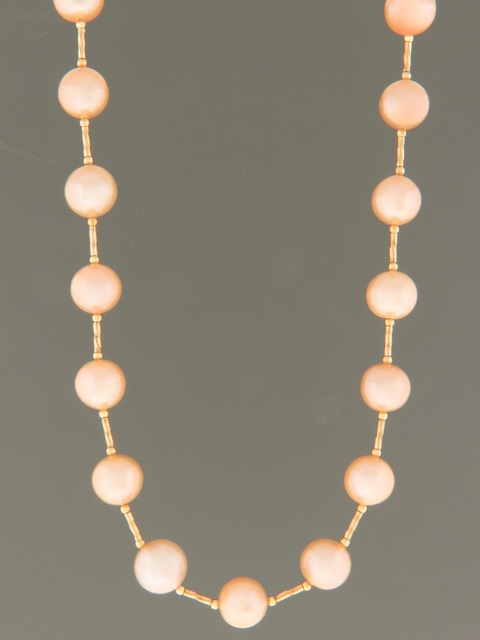 This necklace features pink Pacific Pearls with twisted Gold tube beads.