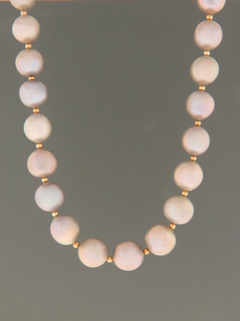 This necklace features silver Pacific Pearls, graduated in size with 3mm round Gold beads.