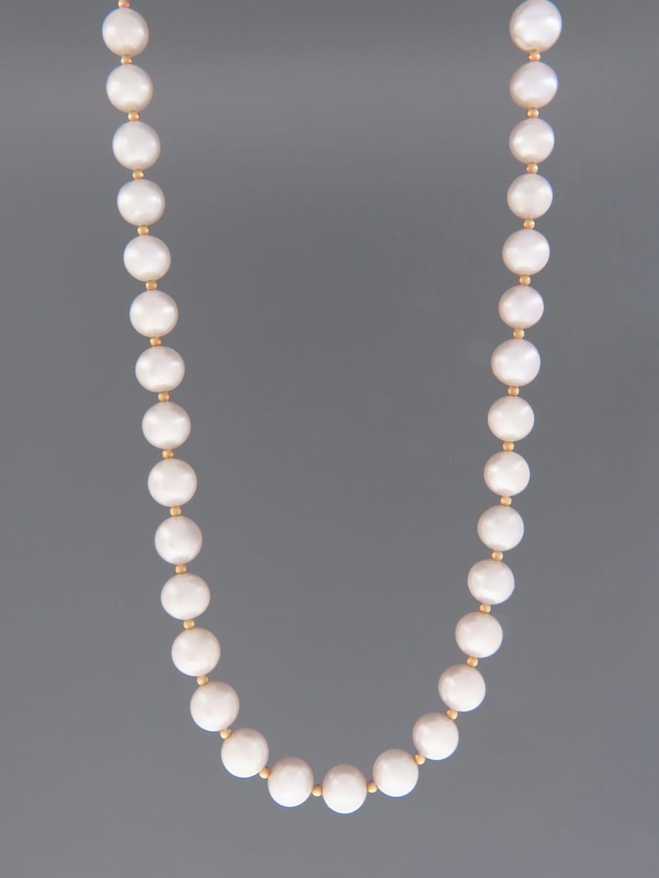 A necklace featuring silver/grey Pacific Pearls with 2.5mm round gold beads.
