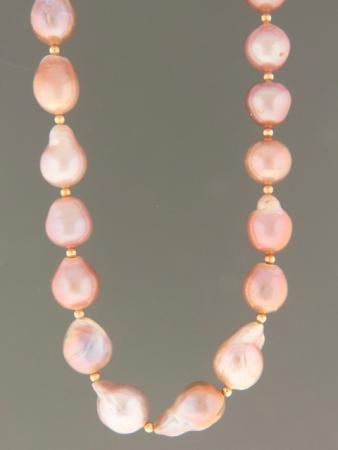 This necklace features pink Baroque (irregularly shaped) Pearls, graduated in size with 3mm round Gold beads.