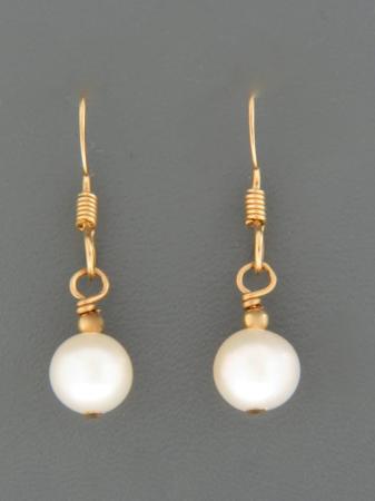 A drop style earring featuring white Pacific Pearls with gold beads.