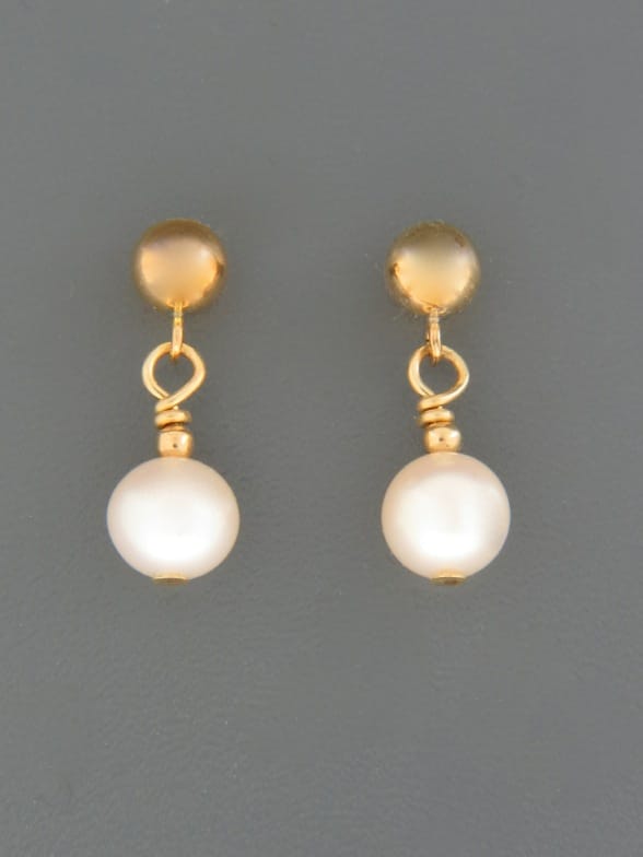 These Gold drop style stud earrings feature round white Pacific Pearls.