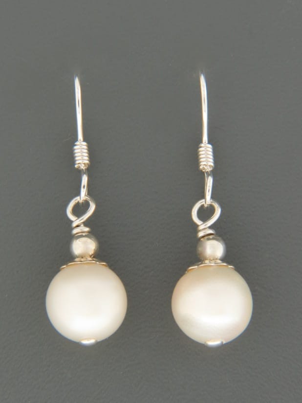 These Sterling Silver drop style earrings feature round White Pacific Pearls with Sterling Silver beads.