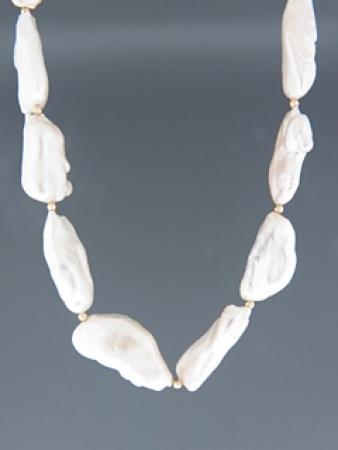 This necklace features graduated white Baroque Pacific Pearls with Gold beads.