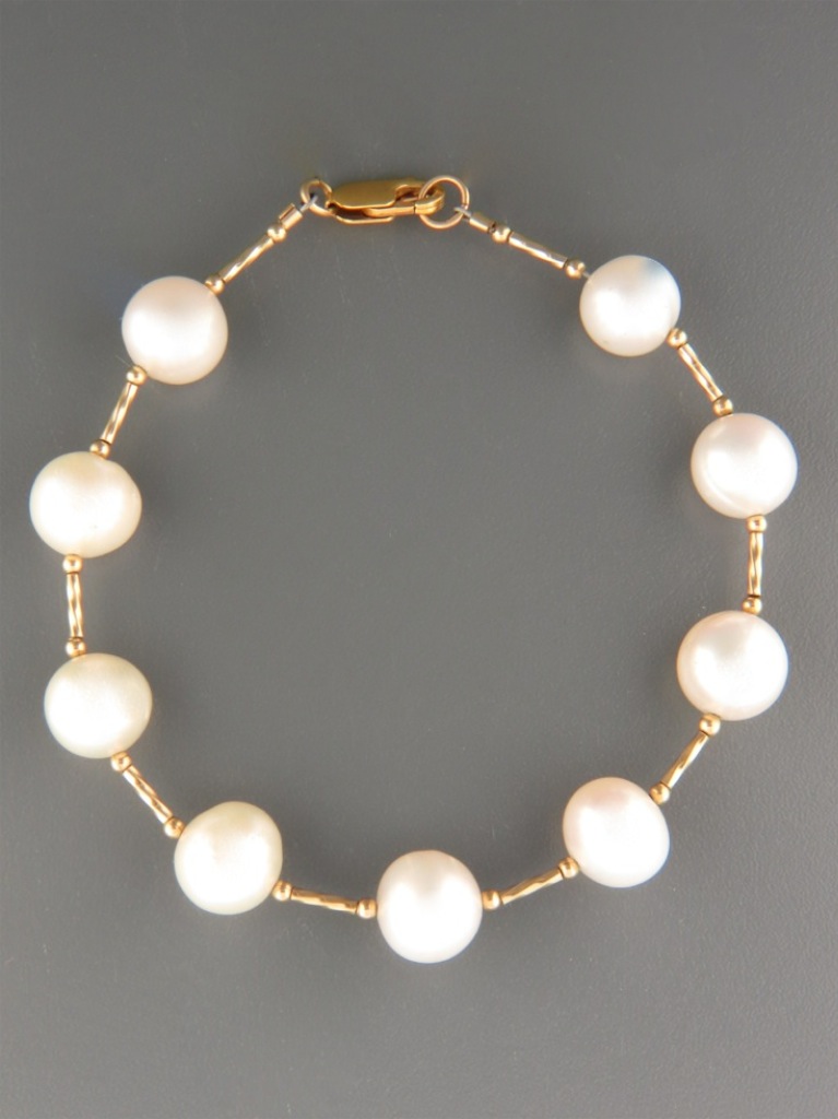 This bracelet features white Pacific Pearls with twisted Gold tube beads.