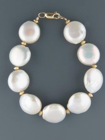 This bracelet features white “Coin” (disc shaped) Pearls with Gold beads.