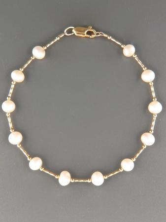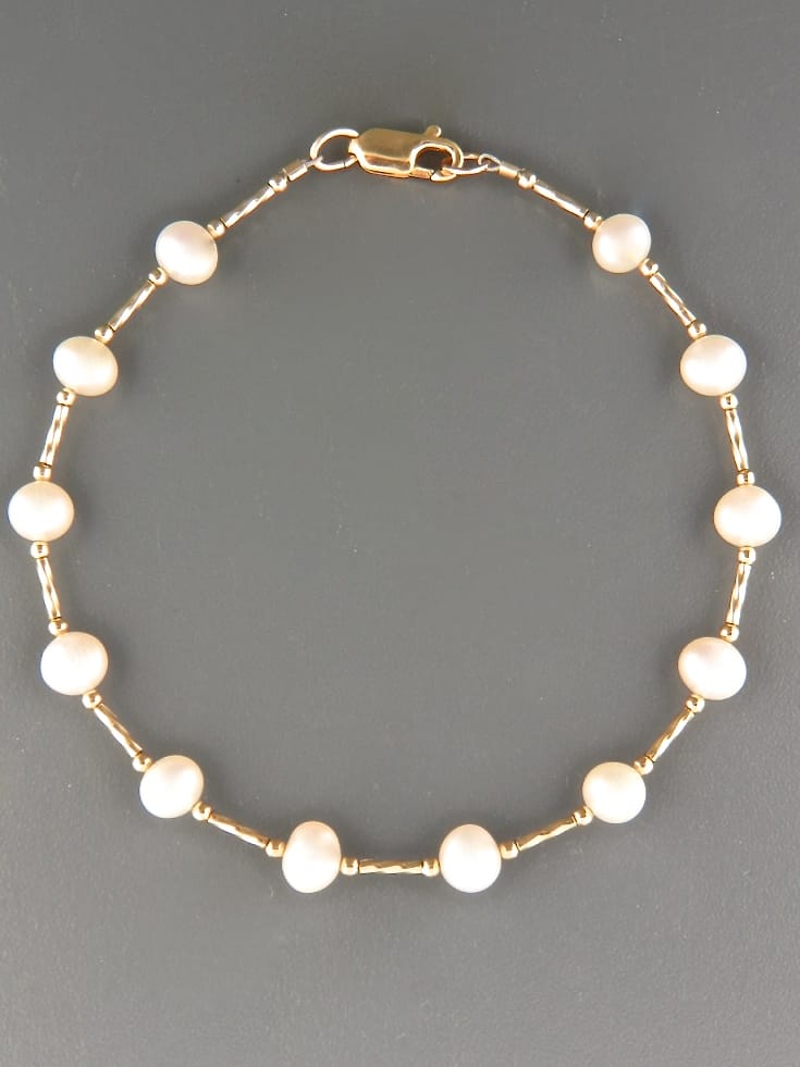A bracelet featuring white Pacific Pearls with Gold twist beads.