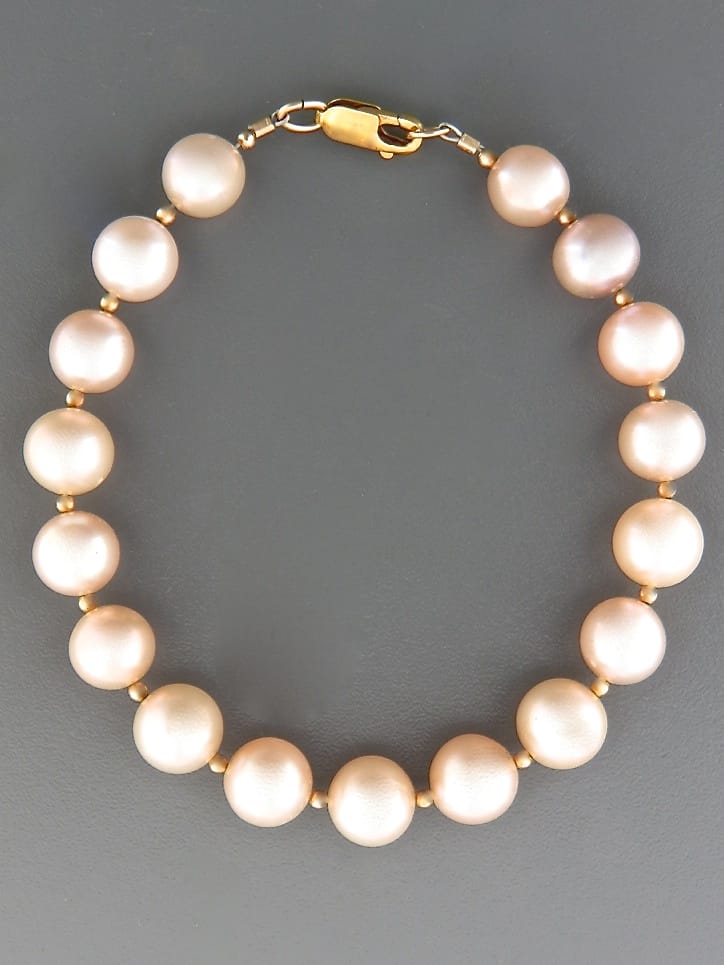 A bracelet featuring pink Pacific Pearls with 2mm round gold beads.